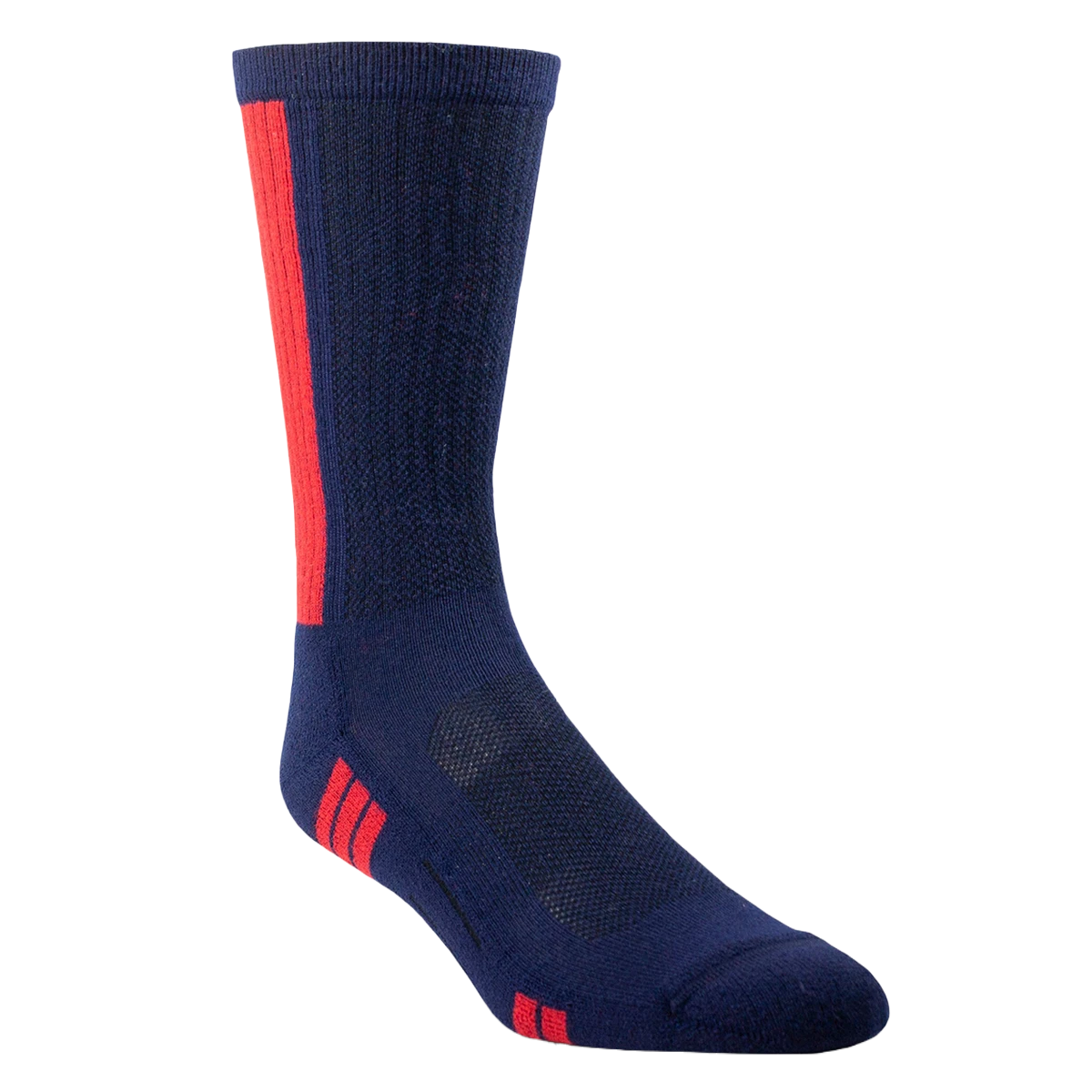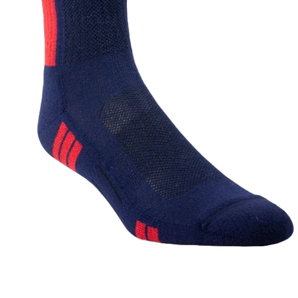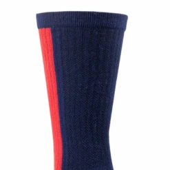 - Navy and red mid-calf socks.