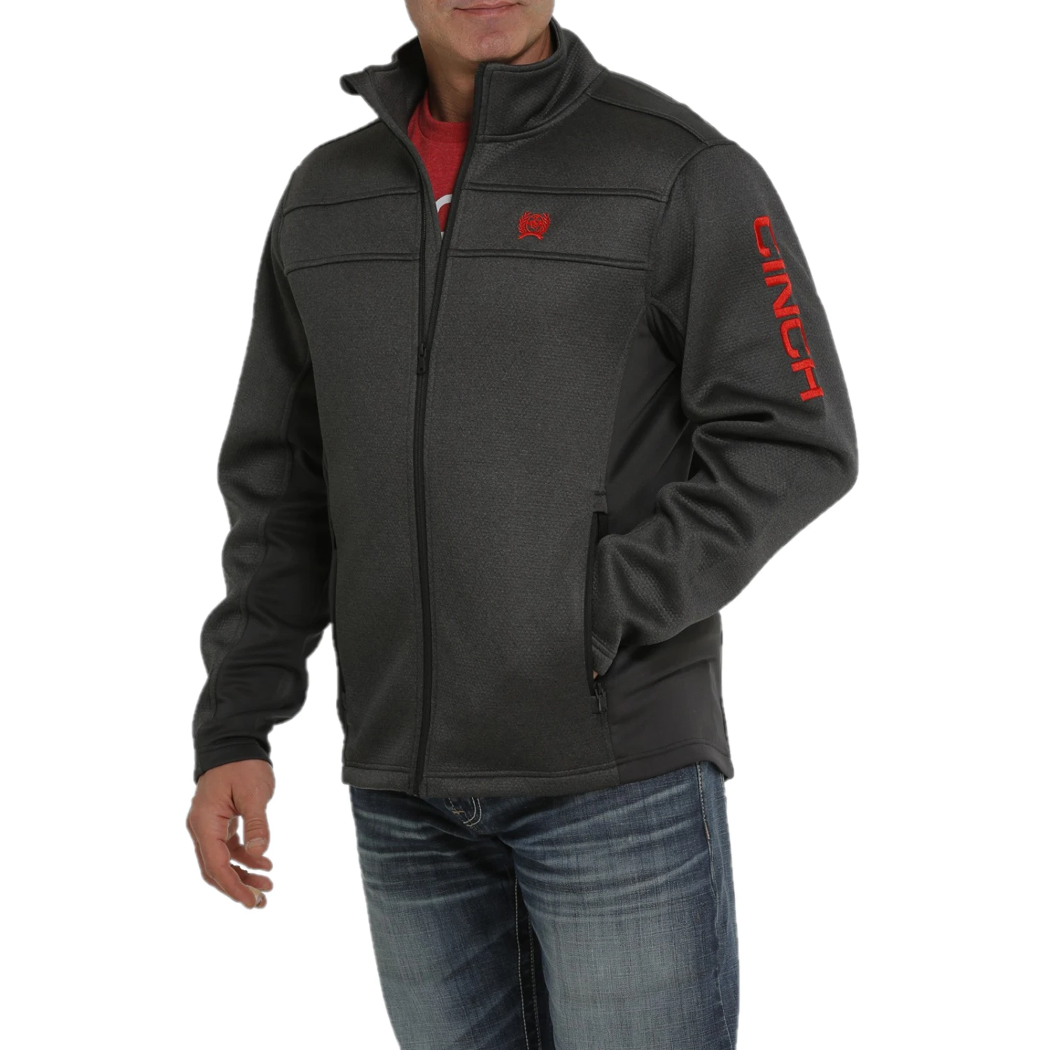 - Red cinch logo embroidered on chest.